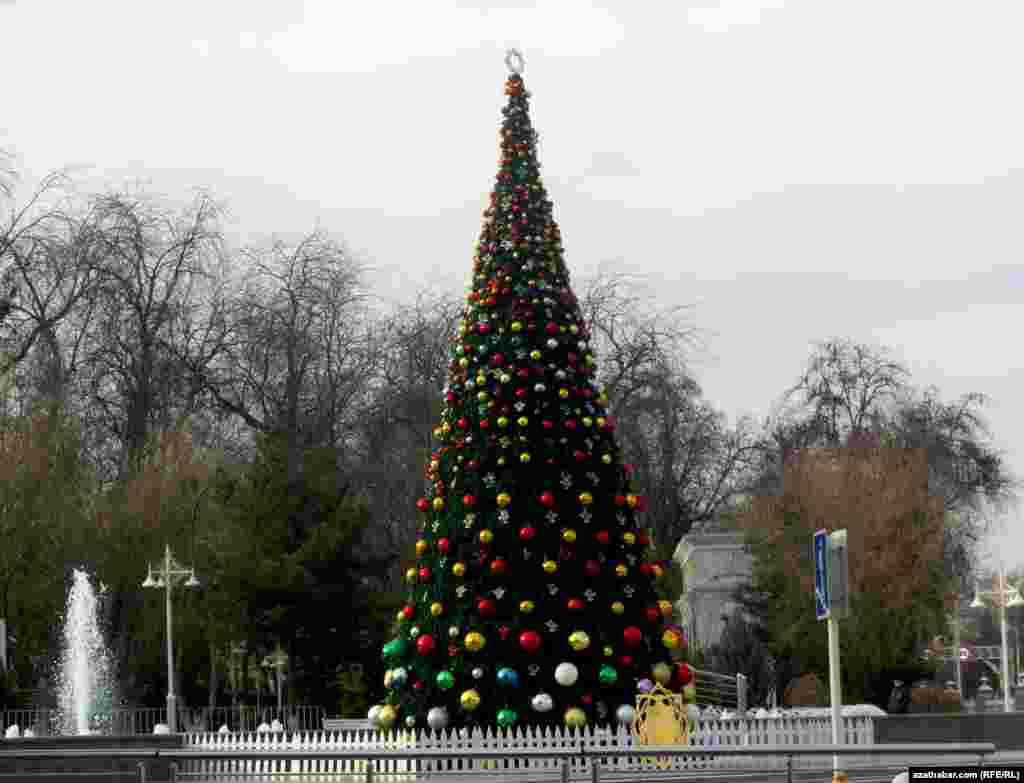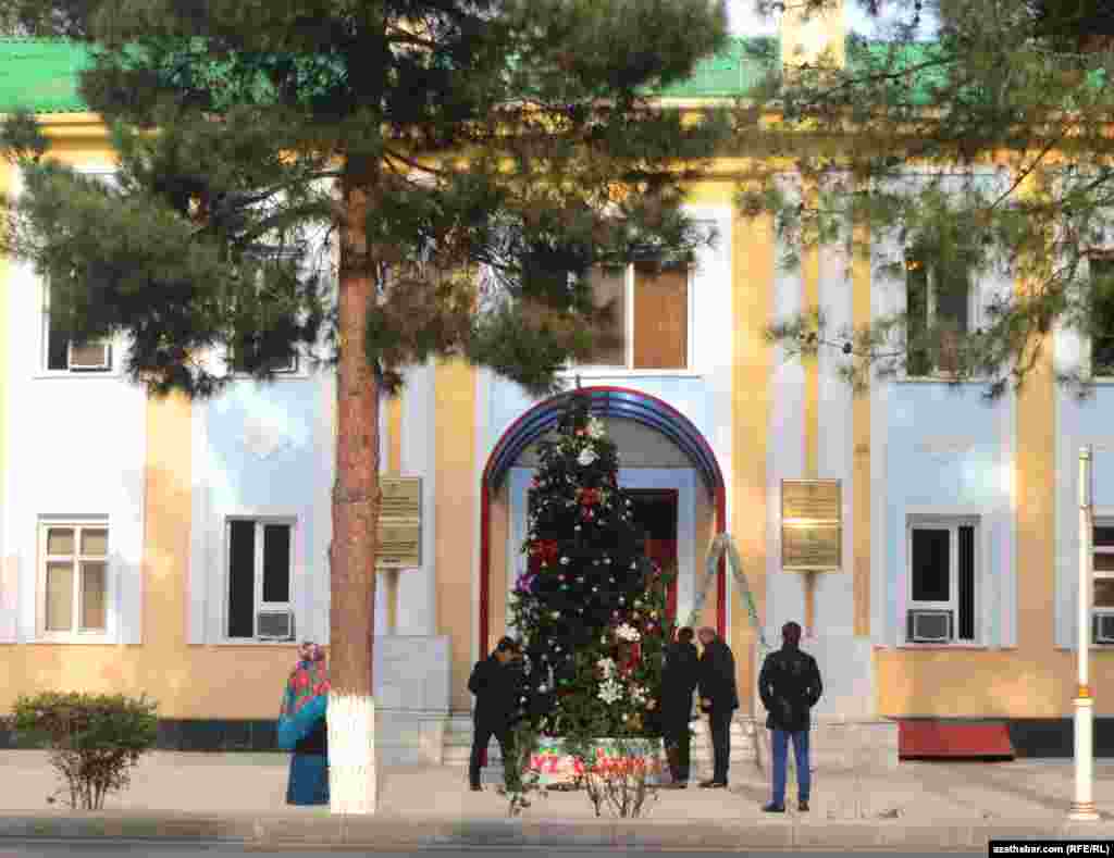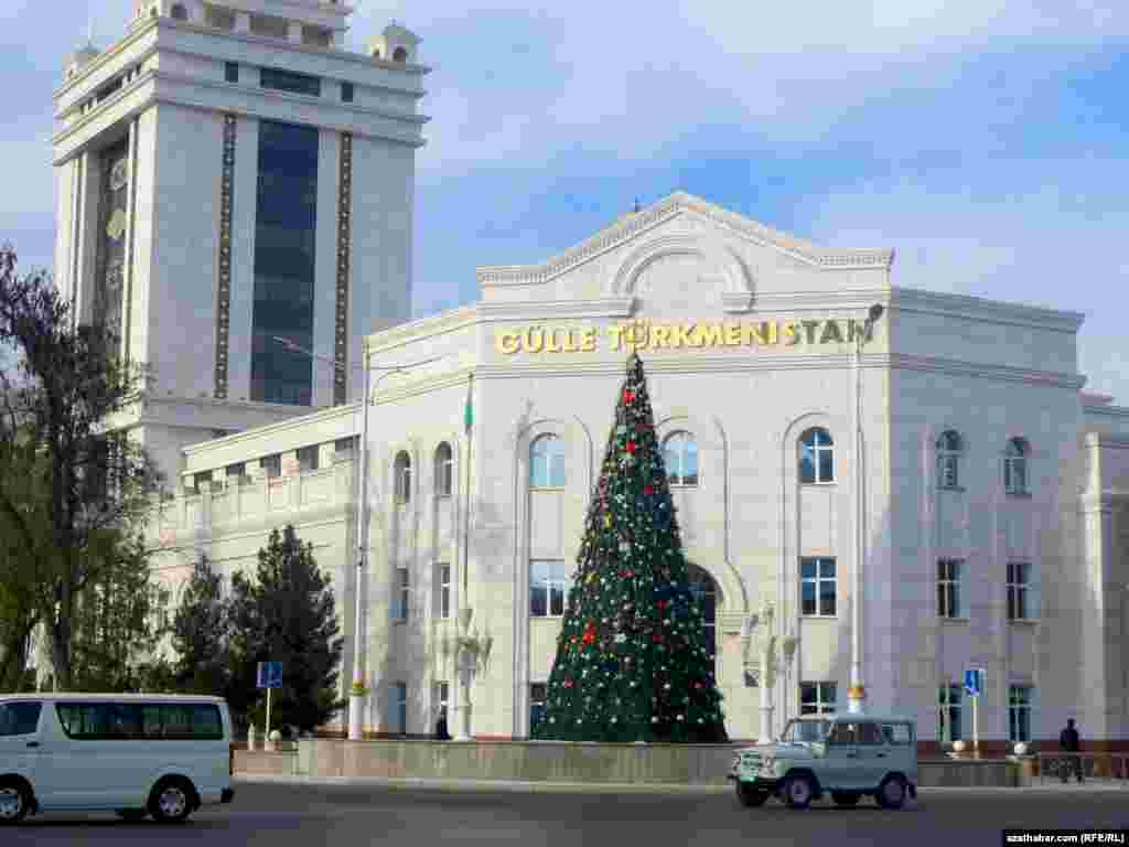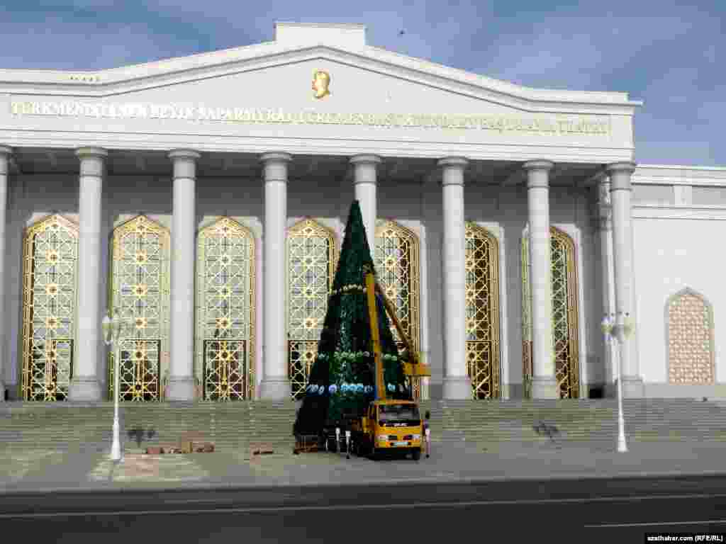 Ашхабад готовится к новогодним мероприятиям. Перед каждым государственным учреждением столицы Туркменистана установлены новогодние елки.