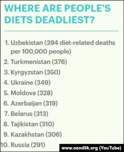 Согласно результатам исследования, проведенного в период с 1990-го по 2016 год, из-за неправильного питания в Узбекистане на 100 тысяч населения жертвами вредных пищевых привычек стали 394 человека.