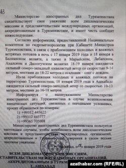 Предупреждение о шторме получили и зарубежные представительства в Ашхабаде. Редакция Азатлыка располагает копией официального уведомления, полученного одним из зарубежных дипломатических представительств в Туркменистане.