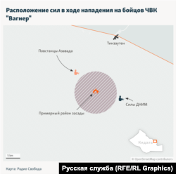 27 июля стало известно о самом крупном поражении, которое российские наемники потерпели за время своего присутствия в Африке: при отступлении от населенного пункта Тинзаутен на севере Мали они попали в засаду и потеряли убитыми несколько десятков человек. Русская служба Радио Свобода рассказывает, как развивались события субботнего боя в схемах и картах.
