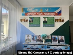 На стене школы также портреты лейтенанта артиллерии Долаана Донгака, фермера Белека Биче-Оола, воевавшего в составе ЧВК «Вагнер», добровольцев-контрактников Марата Шулуу-Маадыр и Эртине Ондар. Однако погибших из села Самагалтай гораздо больше, чем портретов — не менее 17 человек. Например, в июле 2024 года в Украине погиб 28-летний Аяс Эренчин, который отправился на фронт из колонии.