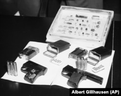 Разработанное ЦРУ оружие выпускало стрелу с замороженным токсином моллюсков, который почти бесследно растворялся в теле жертвы. Смерть была похожа на гибель от сердечного приступа. Пистолет на фотографии выше — она сняты во время слушаний в Сенате в 1975 году о злоупотреблениях американской разведки — стрелял почти бесшумно и был эффективен на дистанции до 100 метров.