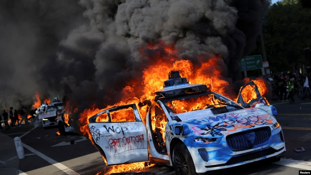 Автомобиль, сожжённый в ходе беспорядков в центре Лос-Анджелеса, 8 июня 2025 года. Фото Рейтер